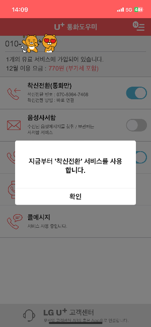 LG 유플러스는 아래와 같이 가능하다. 우선 착신 결제는 아래 처럼 고객센터 앱으로 하고, 착신을 설정하는 것은 U+ 통화도우미 앱으로 가능하다.